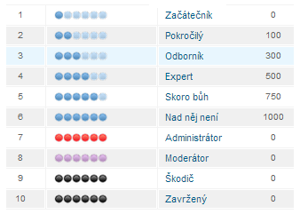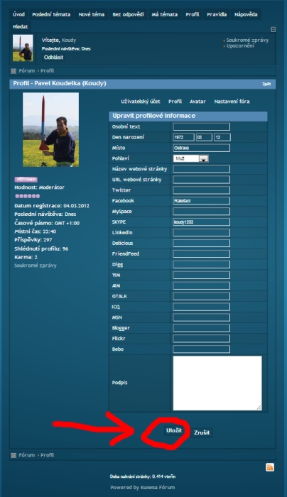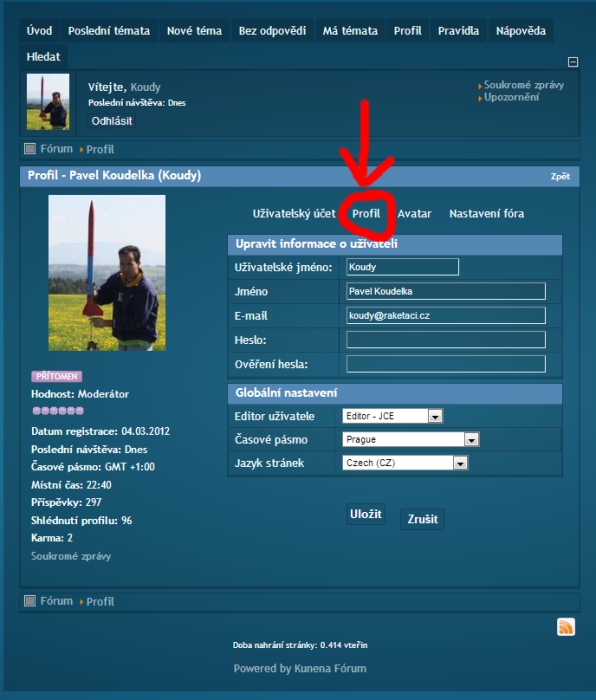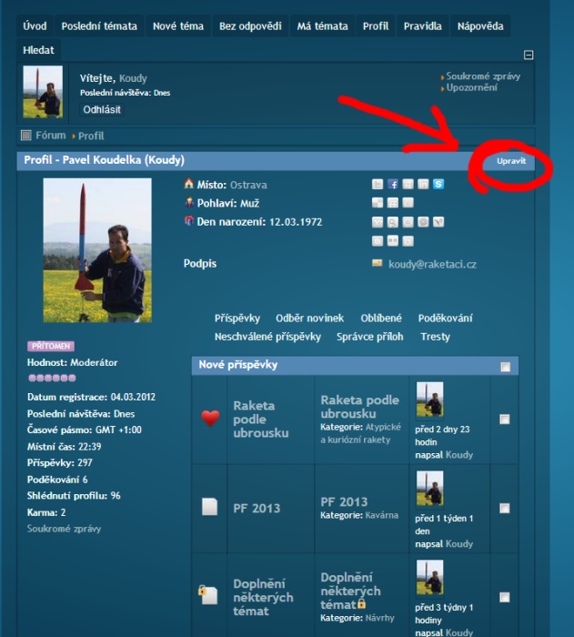 Za prvé každý má u svého jména a obrázku uvedenu hodnost. Tu přiděluje systém sám a vyjadřuje jak je daný uživatel na fóru aktivní. Kolik vloží příspěvků, je jedno jestli dotazů či odpovědí. NAŠE STATISTIKY (Nikoli jaký je zručný modelář a jak dlouho se raketám věnuje) Viz tabulka: Dále každý má možnost doplnit si údaje o sobě. Já nemám oprávnění údaje vkládat či měnit za Vás. Neznám Vaše heslo abych se za Vás přihlásil. Ale stačí kliknout na svůj obrázek a dát "upravit" dále kliknout na "profil" vyplnit co chcete a hlavně uložit. |