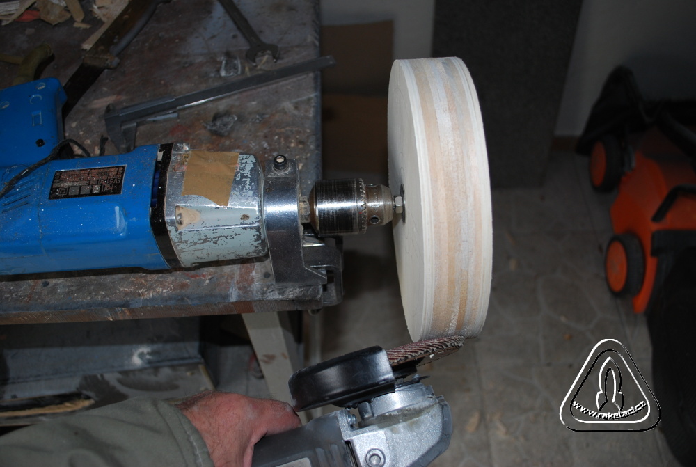 Při stavbě modelů, zvláště těch větších, se dostáváme do problémů, jak zhotovit formu krytu motoru letadla nebo hlavici větší rakety. Každý nemá soustruh na dřevo a tak si může pomoci jako já. Vystačíme s vrtačkou upevněnou v držáku na stole, která má malé otáčky asi tak 600 a s úhlovou frikční bruskou, která má kotouč ze skládaných hrubších smirkových papírů. Potřeboval jsem žebra o průměru 210 mm a tak jsem je vyřezal z překližky a balzy, uprostřed vyvrtal otvory průměr 8 mm.