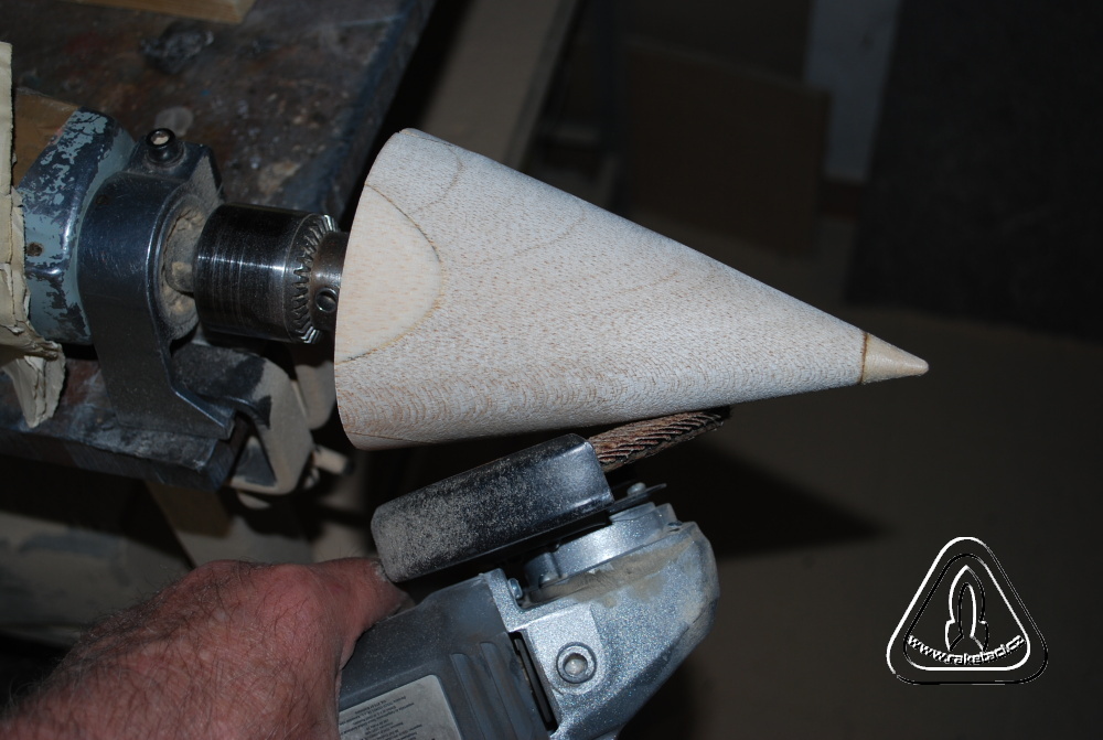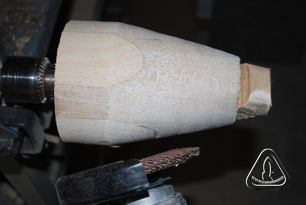 Při výrobě hlavic pro rakety s větším průměrem než 100 mm jsem postupoval obdobně. Poslepoval jsem balzový špalek a prkénka tak, abych z něj vytvořil patřičný průměr. /obr.3/ a seřízl hrany, které by se musely stejně obrušovat. Do sklíčidla vrtačky jsem upevnil vrut o průměru 10 mm /bez hlavy/, který vyčníval 70 mm. Do špalku jsem vyvrtal uprostřed díru průměr 6 mm a špalek natočil na vrut až ke sklíčidlu. Pak už stačilo pustit vrtačku na malé otáčky, přiložit brusku a vytvářet tvar, jaký jsem potřeboval. / obr. 4 a 5/Broušení má tu výhodu, že i rozdílné tvrdosti dřeva na každé polovině nevadí, je stále kulatý povrch, což u zpracování dlátem, nebo smirkem nedokážete. Naopak nevýhodou je značné množství prachu, ale výsledek stojí přeci za to.
