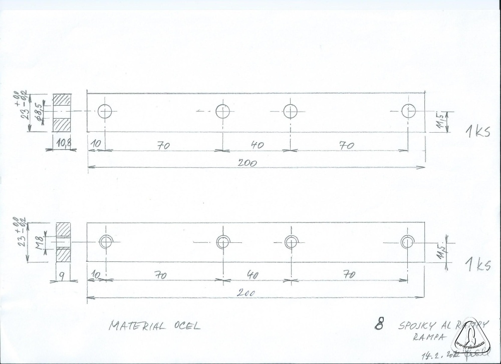 Spojka rampy – rozměry jsou pro použitý nosník a musí být přesné, aby při vsunutí do nosníku nebyla vůle a tím zajištěna rovinnost rampy.