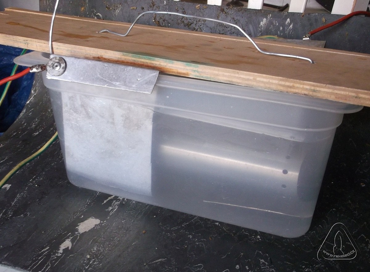 3) Nyní můžeme začít z eloxováním. Do plastové nádobě potřebné velikosti nalijeme zředěnou kyselinu sýrovou v poměru 15 až 20procent. Nejlépe doředit akumulátorovou kyselinu která jde běžně koupit v drogerii. Na 1,32l kysleliny do baterky, 0.68l vody máme 2l 20procentního pracovního roztoku. Vždy lijeme kyselinu do vody a stále mícháme. Pozor na oči a kůži! Do nádoby ponoříme dvě katody z hliníkového plechu (lepší je olovo nebo titan!) o minimálně stejné ploše jako eloxovaný předmět, ale ideálně až o 3x větší ploše než je eloxovaný předmět. Z mé zkušenosti funguje dobře i varianta s menšími katodami. Katody se propojí měděným kabelem mimo lázeň! a připojí k mínus polu na regulovatelný zdroj stejnosměrného proudu (klasická stará autonabíječka). Anoda je eloxovaný předmět, který připojíme k plus polu hliníkovým! kabelem (bez izolace). Anoda se nesmí dotýkat katody, došlo by ke zkratu! Máme nálev, máme připojeny kabely....pustíme proud. V první fázi na minimum a postupně během prvních dvou minut přidáváme proud až dosáhneme hodnoty kolem 2 až 2,5A. Z katod se musí viditelně začít uvolňovat bublinky a bílá mlha, směřující k anodě. pokud se toto děje, je vše v pořádku a eloxujeme. Pokud se neobjeví do minuty bublinky, je špatně připojený většinou plus pol k anodě. Pozor, k upevnění drátu k anodě nepoužívat nic než hliník!!! A tam kde je drát omotaný kolem kusu, nebude provedena eloxace!