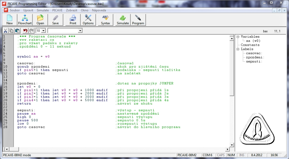 Zde na fóru se objevil návod na časovač s procesorem PIC a tak jsem si ho chtěl vyrobit. Narazil jsem však na problém jak dostat do zakoupeného procesoru PIC program. Programátor k tomu sloužící je pro mě zbytečný a drahý a tak jsem našel obdobu, místo procesoru PIC procesor PICAXE. Ten je sice o něco dražší, ale má v sobě nainstalovaný zavaděč, něco jako operační systém.