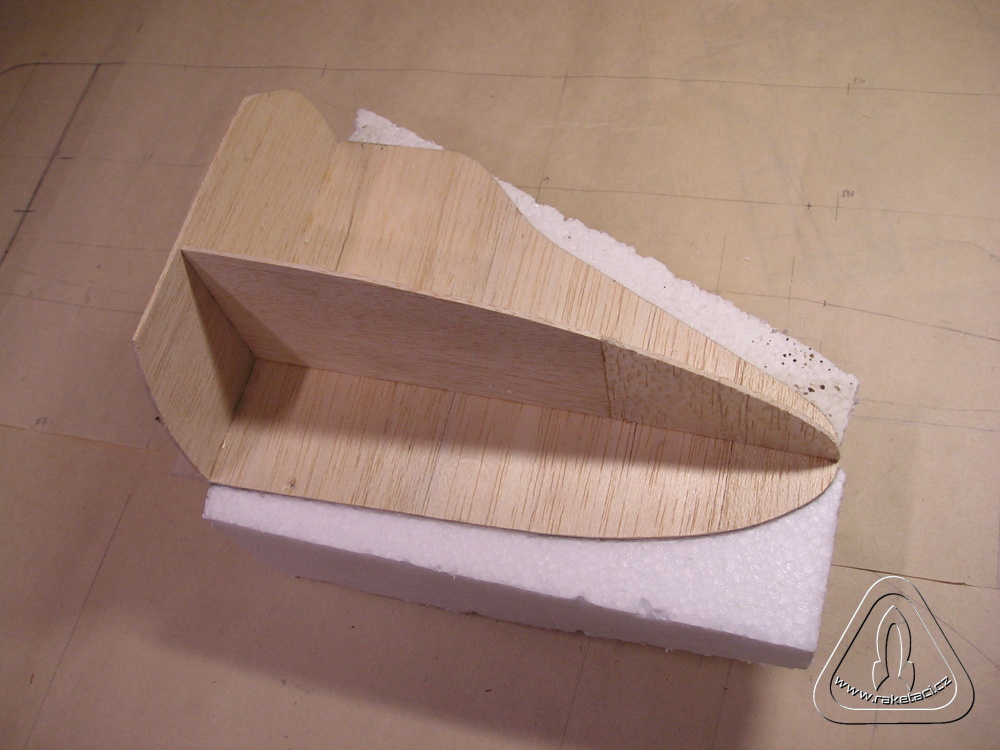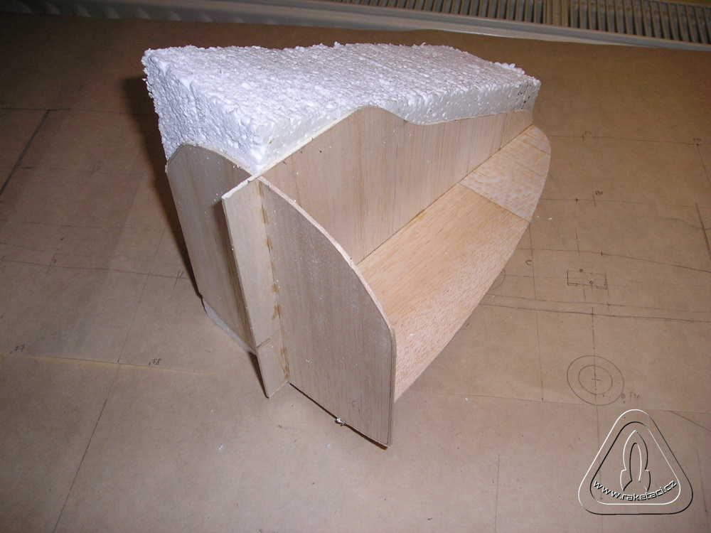 Do takto slepené konstrukce jsem Herkulesem nalepil bloky polystyrenu, pokud možno tak silný, aby nebyly nikde lepené spoje. Pokud musíme lepit polystyren ze slabších dílů je dobré díly k sobě lepit tak, aby lepidlo bylo asi 5 – 10 mm od předpokládaného broušeného profilu. Lepidlo se špatně brousí, vytváří hranu, protože ubývá měkčí polystyren. Při broušení tvaru hlavice skelným papírem na prkénku, je dobré si udělat vnější šablony tvaru v místech, kde budou zevnitř žebra. Stačí jen z tvrdšího papíru, usnadní to práci a předělávání. Balzové vlepené profily nám vytvářejí základ pro broušení!