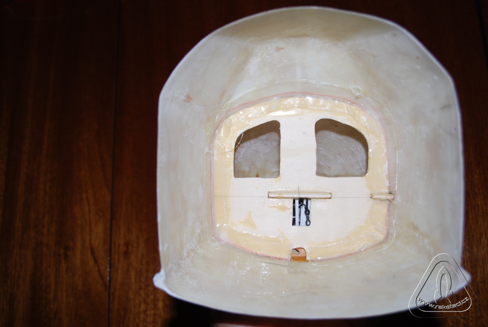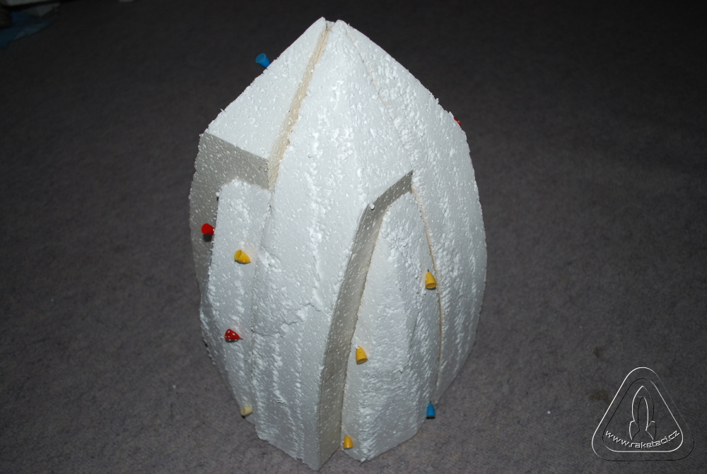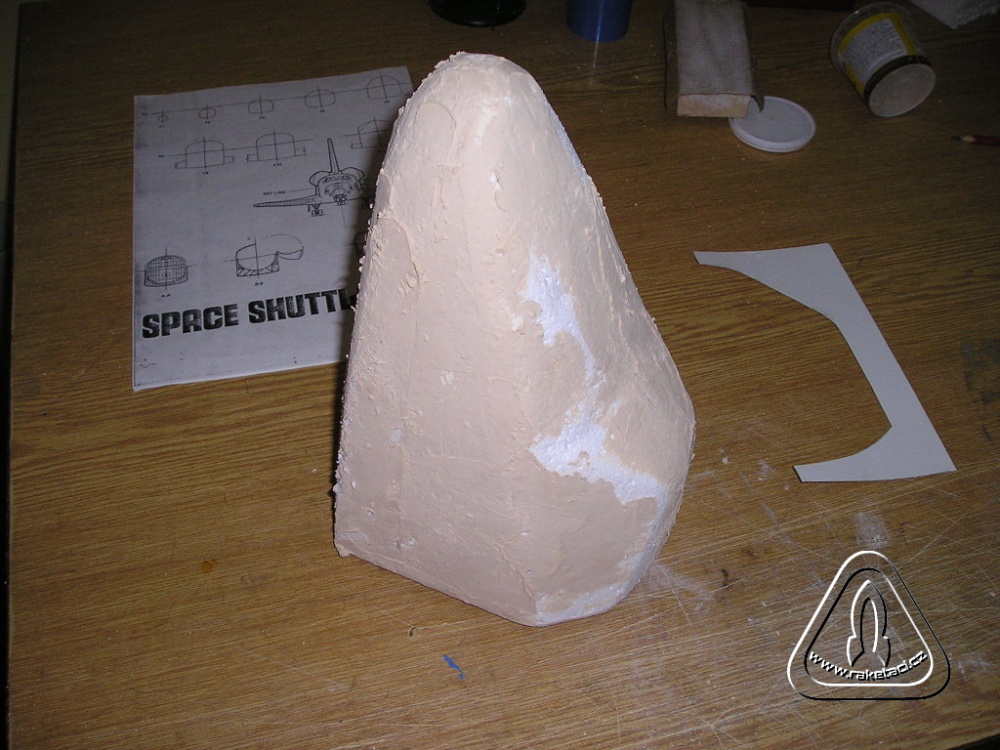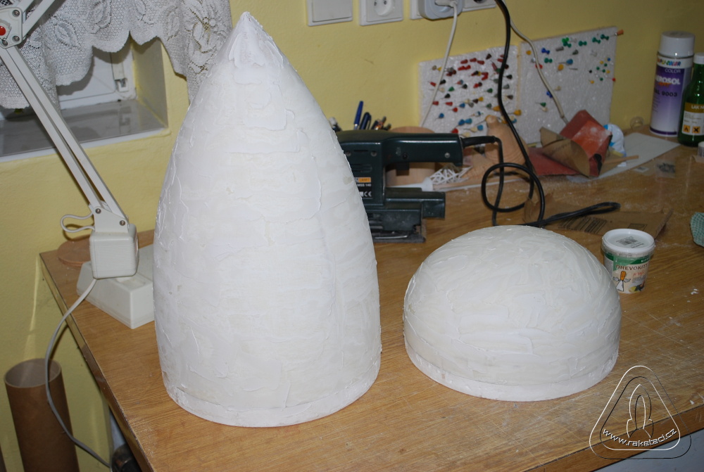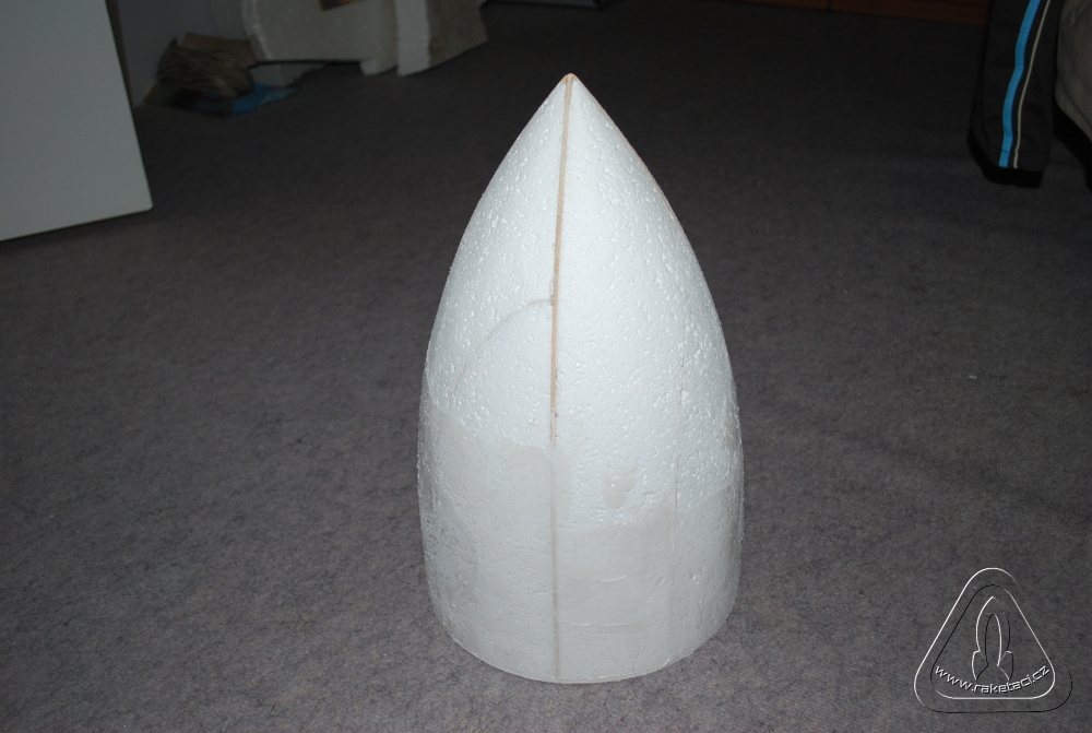 U raketových modelářů je vždy problém jak udělat hlavici o velkém průměru a hledá se jak ji vysoustružit a z čeho. Na nosnou raketu jsem potřeboval průměr hlavice 260 mm a délku 450 mm. Opět jsem použil metodu ztraceného modelu. Základem byla kruhová deska z balzy tl. 3mm a dva vyříznuté profily tvaru hlavice rovněž z balzy 3 mm. Z jednoho jsem uprostřed vyřízl 3 mm a profily přilepil kolmo na kruhovou desku, což mi vytvořilo základ hlavice. Nalepil jsem polystyren obr. 7 a vybrousil tvar hlavice obr. 8. Opět balzová prkénka tvoří základ tvaru, ale pro usnadnění broušení stačí vystříhat mezikruží na různých průměrech hlavice a opatrně pomalu brousit a poměřovat. Při trošce pečlivosti se vám to podaří, a pokud probrousíte, nic se neděje. Jen odkrojíte kus polystyrenu, nalepíte nový silnější a zopakujete si broušení! Opět tmelíme obr. 9 a laminujeme obr .10 a 11, jako v předchozím případě. Pro zpevnění špičky jsem vysoustružil na vrtačce z balzy vrchol, který jsem po odříznutí polystyrenu přilepil natupo, jak je vidět na obr. 10. Protože jsem potřeboval raketu dovažovat, nebylo nutné ani polystyren z hlavice dobývat a nechat jej jako zátěž.