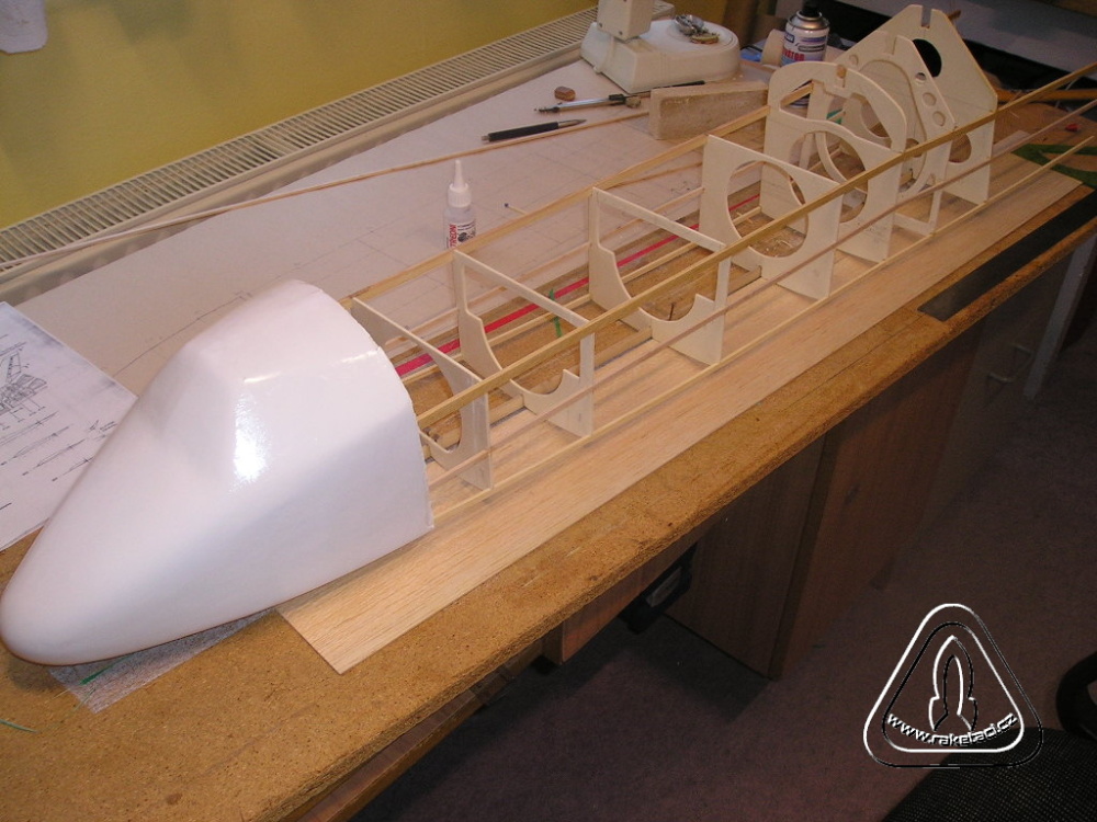 Do takto slepené konstrukce jsem Herkulesem nalepil bloky polystyrenu, pokud možno tak silný, aby nebyly nikde lepené spoje. Pokud musíme lepit polystyren ze slabších dílů je dobré díly k sobě lepit tak, aby lepidlo bylo asi 5 – 10 mm od předpokládaného broušeného profilu. Lepidlo se špatně brousí, vytváří hranu, protože ubývá měkčí polystyren. Při broušení tvaru hlavice skelným papírem na prkénku, je dobré si udělat vnější šablony tvaru v místech, kde budou zevnitř žebra. Stačí jen z tvrdšího papíru, usnadní to práci a předělávání. Balzové vlepené profily nám vytvářejí základ pro broušení!